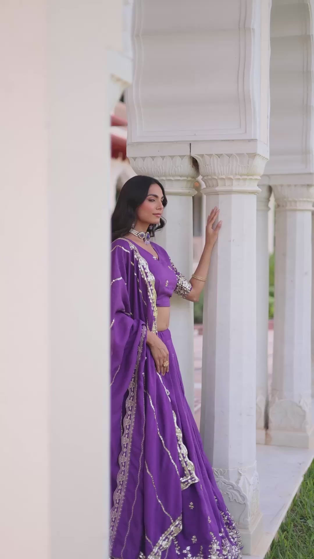 A beautifully crafted lehenga choli set made from premium Vichitra silk, detailed with rich sequins and zari multi-embroidery for a graceful festive look. The fully stitched lehenga features a generous 3-meter flair with canvas patta stitching for structure and comfort, while the matching blouse comes unstitched for a customized fit. Completing the set is a designer dupatta adorned with sequins embroidery and an attractive lace border, making it suitable for weddings, festive gatherings, and special occasions.